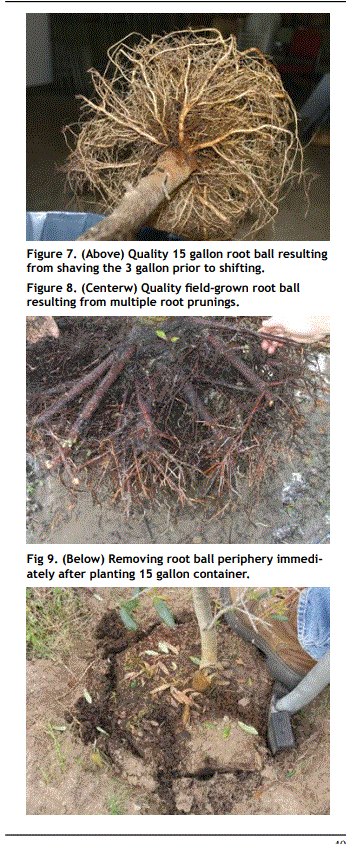 Una vez que las raíces comienzan a dar vueltas o sumergirse por el costado de la maceta, deben retirarse por completo al cambiar a contenedores más grandes (Fig. 4) para que los segmentos de raíces retenidos estén orientados radialmente, relativamente rectos y crezcan principalmente horizontalmente desde el tronco.