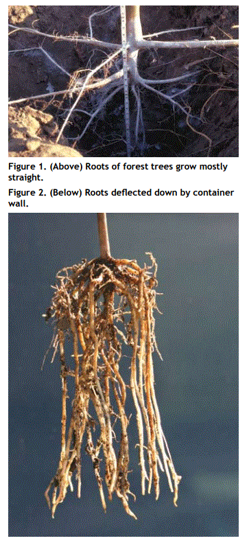 Los árboles propagados en contenedores tienen sus desafíos, pero la tecnología puede ayudar. Las raíces crecen alrededor de la maceta y descienden hasta el fondo de forma natural, o son desviadas allí por las paredes del recipiente. Esta forma de raíz puede resultar en inestabilidad de los árboles y un sistema de raíces anormalmente profundo que no es adecuado para suelos compactados en paisajes urbanos (Fig. 2).