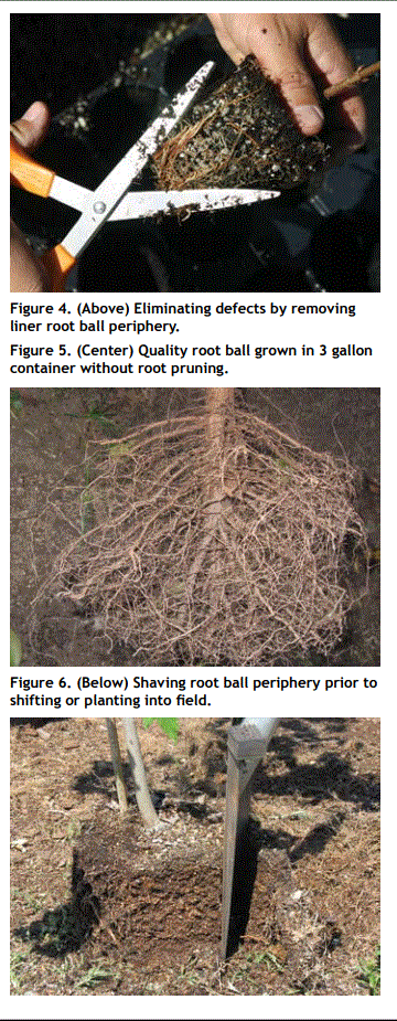 Las nuevas técnicas de propagación, incluidas macetas de papel fino, cubos Oasis® y otras, son prometedoras para producir sistemas de raíces de calidad. Las raíces deben ser rectas y rama (Fig. 3), pero no debe dirigirse hacia abajo o alrededor de la pared del contenedor. Estos defectos pueden convertirse en una parte permanente del sistema de raíces y obstaculizar el crecimiento adecuado, o pueden predisponer al árbol a la inestabilidad o una muerte prematura.
