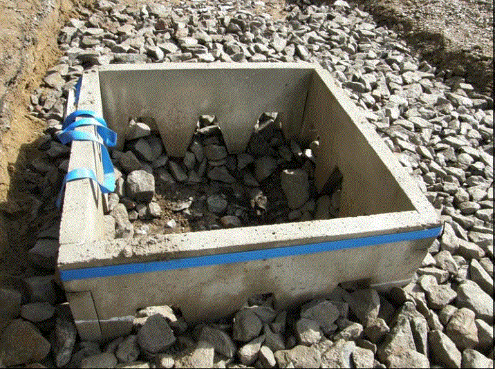 En la parte superior de la piedra compactada, se colocan esquineros para la instalación de una caja cuadrada de hormigón prefabricado para el árbol. El fondo y los orificios en el costado de la caja están abiertos a la mezcla de tierra / piedra compactada. Cuando se completa el proyecto, los árboles se plantan en la caja para que las raíces puedan crecer hacia abajo y hacia el área de plantación de piedra / tierra. Si el árbol necesita ser reemplazado, el árbol viejo se saca fácilmente de la caja de hormigón y se planta un árbol nuevo en la misma caja.