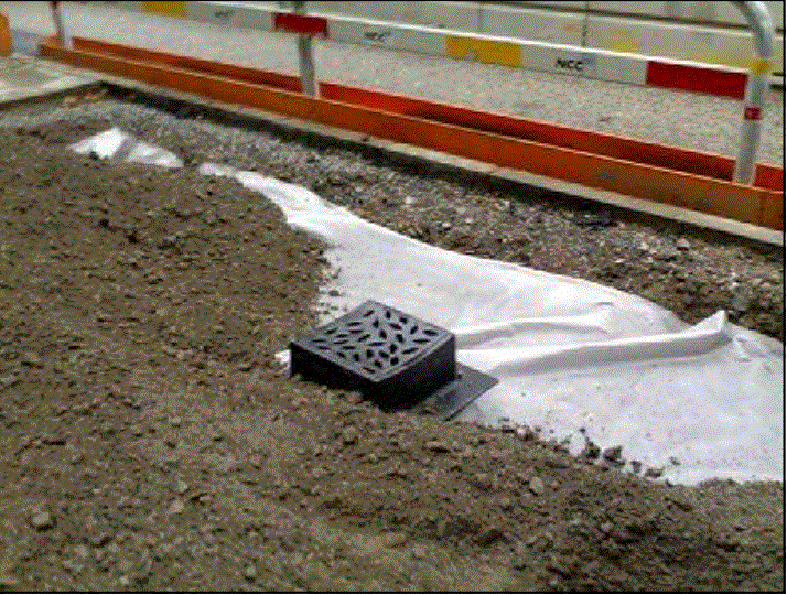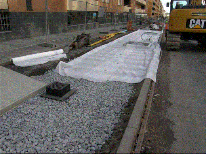 Toda el área también se utiliza para la contención de aguas pluviales. Las cuencas de drenaje se asientan en la parte superior de la mezcla de piedra / suelo para que el agua que corre por la superficie del pavimento pueda fluir hacia abajo, a través de la piedra y hacia la zona de raíces de los árboles. A medida que el agua fluye a través de la mezcla de piedra y tierra, los árboles la utilizan. Cualquier exceso de agua se vacía en el drenaje pluvial original de la calle. Los sumideros en la nueva construcción están construidos con una pantalla de metal cerca del fondo donde el oxígeno también puede ingresar a la mezcla de suelo / piedra. El oxígeno es absorbido por las raíces de los árboles y evita el estancamiento del agua. Las cuencas de captura junto a los bordillos de las calles y las canaletas de los edificios también proporcionan agua al árbol. Por suerte,