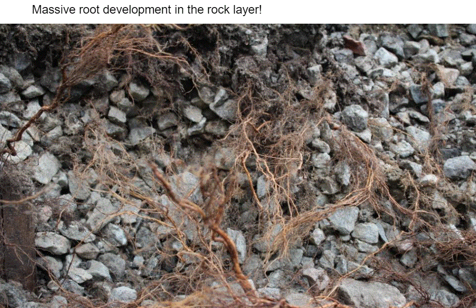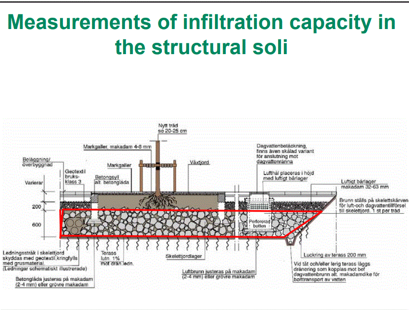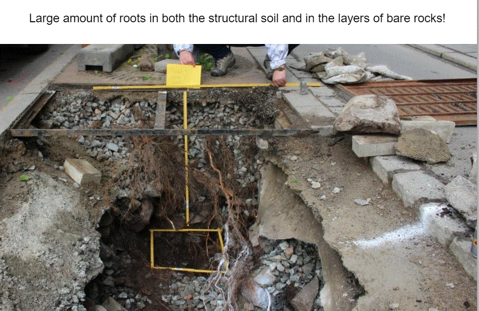 En su búsqueda de respuestas, el Sr. Embren y su equipo descubrieron que a lo largo de los ferrocarriles de Estocolmo, los árboles crecían extremadamente bien en el balasto de piedra junto a las vías. Las rocas en el lastre eran grandes pero estables y tal vez la misma piedra grande podría usarse debajo de los pavimentos de la ciudad para permitir el crecimiento de raíces en los huecos entre las piedras, y la piedra transferiría el peso del vehículo al suelo sólido en la parte inferior. del pozo de plantación. También determinó que las mejores condiciones de suelo para las raíces de los árboles que rodean la piedra deben consistir en un suelo homogéneo donde la distribución del tamaño de las partículas y el contenido de humus se mezclen en los 30 cms superiores del suelo y se ubique el mismo suelo menos el humus. bajo esta «capa superficial del suelo».