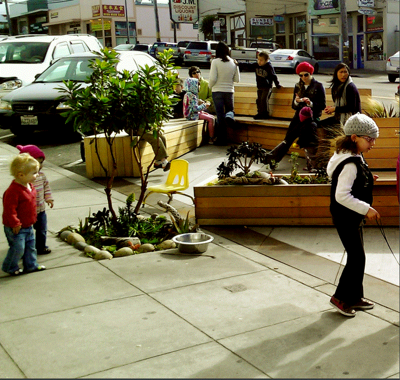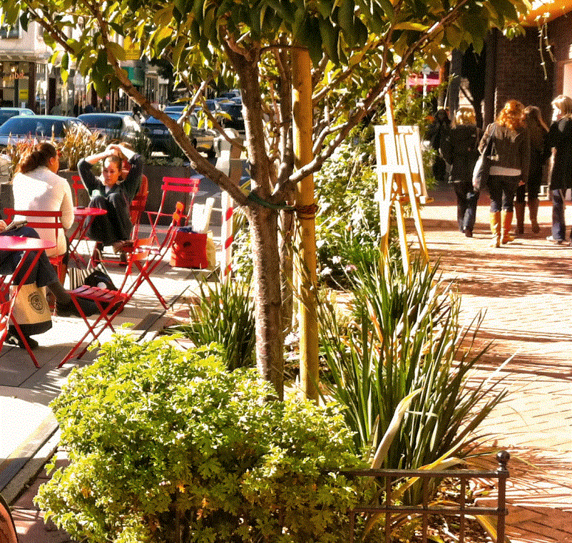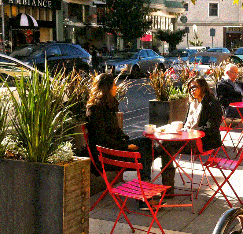 Los parklets se están volviendo populares en la planificación urbana. Los parklets consisten en convertir de 1 a 3 plazas de aparcamiento a lo largo del borde de una calle de la ciudad, en parques muy pequeños. Mientras que una o dos personas utilizan una plaza de aparcamiento por hora, decenas de personas disfrutan de un parklet durante todo el día. Son financiados por empresas cercanas, pero están abiertos a todos. En los lugares donde se han construido, se han vuelto extremadamente populares y un gran impulso para las empresas colindantes.