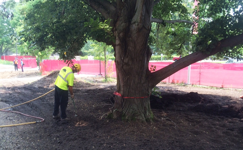 Siempre que las raíces de los árboles que queden  expuestas durante la construcción, Los extremos de las raíces deben cortarse limpiamente y las raíces deben cubrirse con un paño y mantenerse húmedas mientras la raíz esté expuesta. Cuando se van a quitar las raíces durante la excavación, las raíces deben cortarse en el lado del árbol de la zanja antes de excavar las raíces. Esto limita el daño a las raíces.