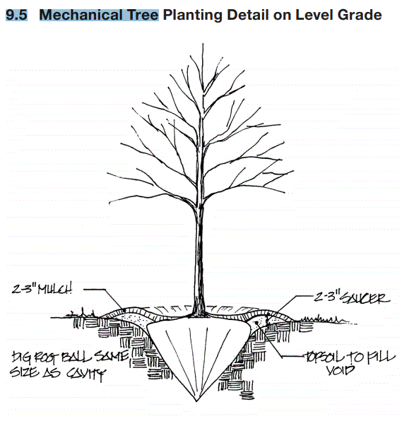 6. Como regla general para árboles jóvenes cultivados en viveros, debe haber dos o más raíces estructurales dentro de 2.5 a 7.5 cm de la superficie del suelo. «Raíces laterales de primer orden» es otro término que se ha utilizado para estas raíces. Si las raíces tienen más de 7,5 cm de profundidad, se rechazará el material. Si el cepellón tiene un tamaño inferior al especificado en la edición actual de ANSI Z60.1, se rechazará el stock.