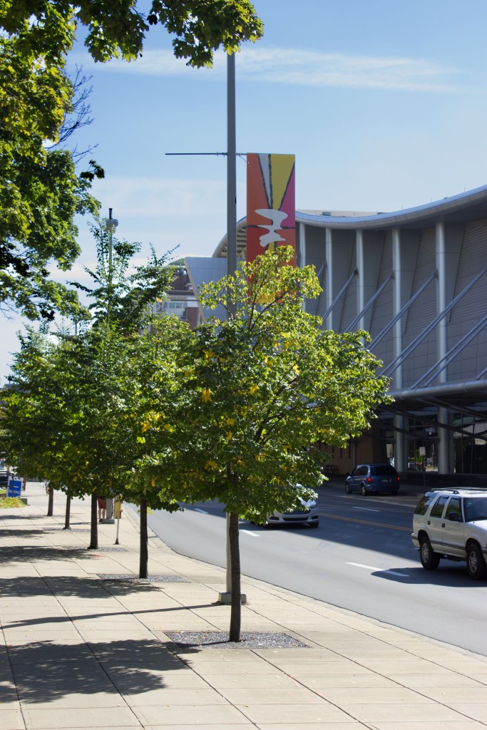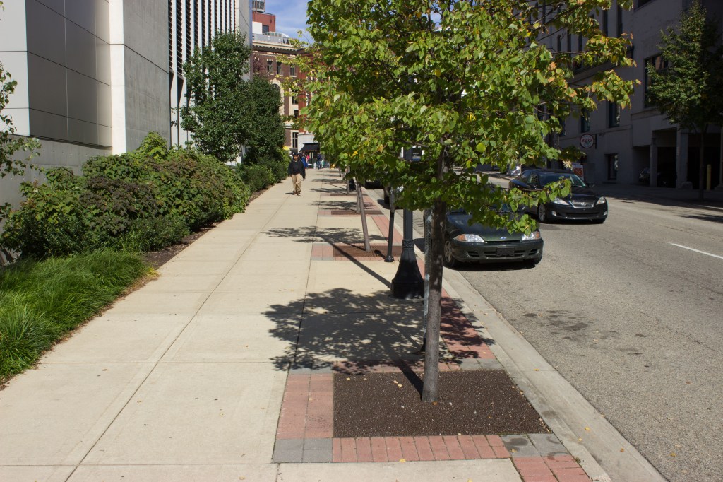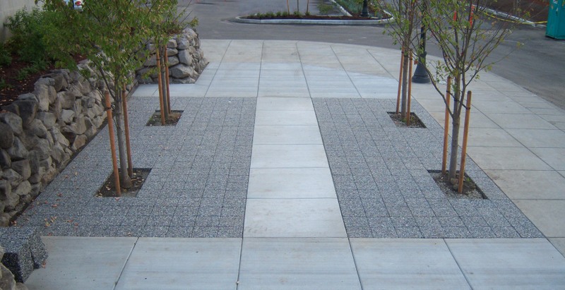 En su continuo esfuerzo por hacer que su centro de la ciudad sea más acogedor y para apoyar sus iniciativas de sostenibilidad, Grand Rapids, MI, está completando el reemplazo de 750 rejas de hierro viejas para árboles con un pavimento poroso. La primera fase del proyecto se completó en septiembre de 2014 cuando la ciudad reemplazó 250 rejillas agrietadas y rotas que presentaban el peligro de tropiezo más grave en el centro de la ciudad. En 2015 se reemplazaron 500 rejillas adicionales para terminar el proyecto. Para dejar espacio alrededor del tronco del árbol, se hicieron tubos de cartón y se cortaron en longitudes de 15 a 20 cms.- y se usaron como mangas alrededor del tronco del árbol antes de agregar el pavimento. Al día siguiente, el material se curó y se retiraron los tubos. El costo del producto resultó ser de unos 400 dólares estadounidenses en comparación con los 800 a 1200 dólares de las rejillas de hierro anteriores. El costo de mantener las rejillas de los árboles y cortar las aberturas más grandes a medida que los árboles crecen puede variar entre $ 100 y $ 200 por árbol. El corte del pavimento poroso debería requerir menos esfuerzo y tiempo que cortar rejillas de hierro fundido, y se puede hacer con una sierra cortando la profundidad del pavimento.