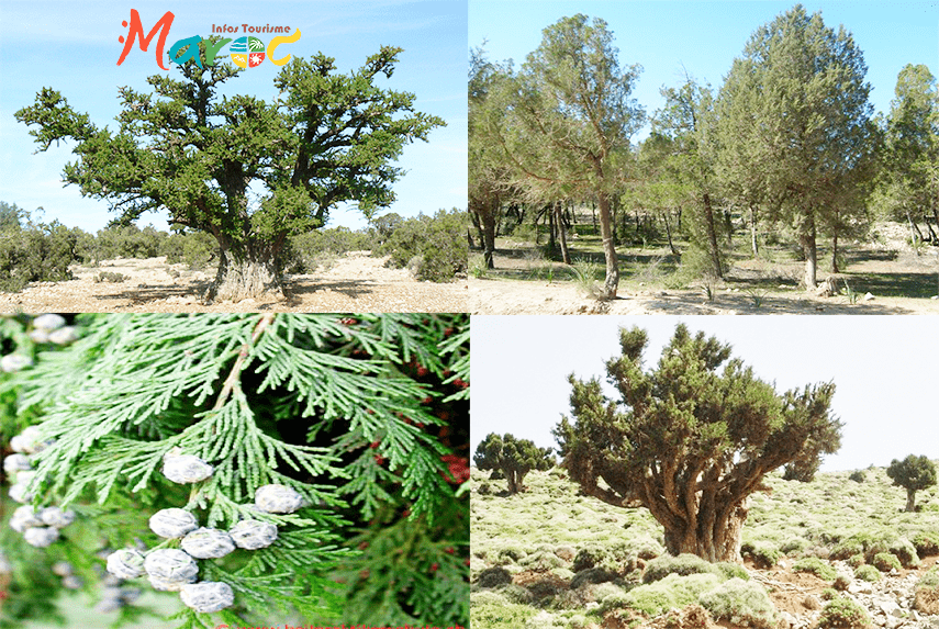 El enebro es una conífera típica de bosques esclerófilos mediterráneos, perteneciente a las Cupresáceas, del género Juniperus. Las sabinas también pertenecen a este género y pueden crecer en dunas o arenales marítimos, una circunstancia típica de la flora de Marruecos. Su madera es muy valorada en ebanistería y para determinados productos, como por ejemplo los lapiceros.