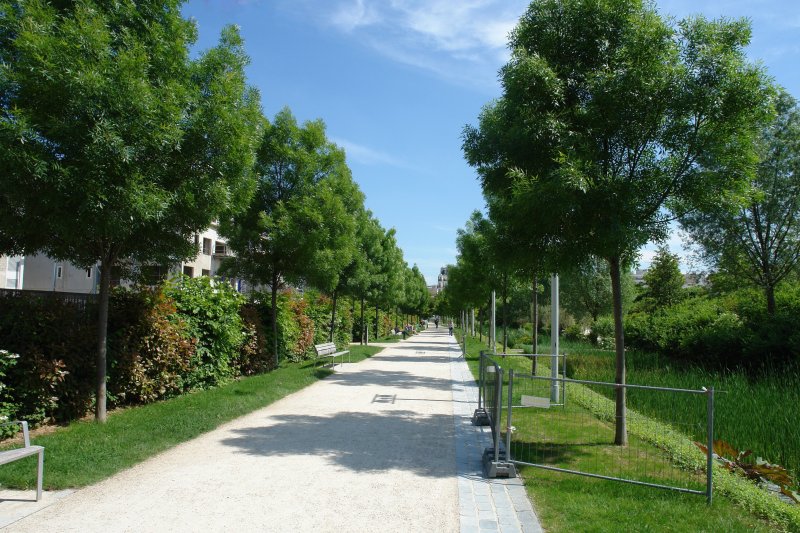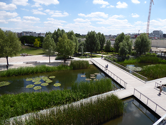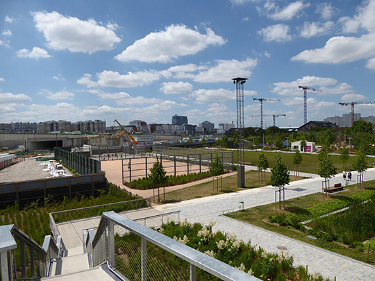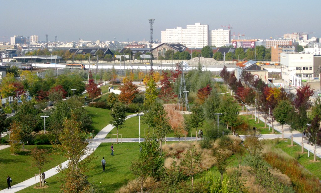 En el centro, el parque se extiende a ambos lados a una pieza de agua que aísla y escenifica el anillo ferroviario interior parisino conservado. La primera fase del parque declina los temas desarrollados en todo el parque: el tema de las estaciones, el tema del agua y el tema del cuerpo: estética deportiva y usos recreativos.
