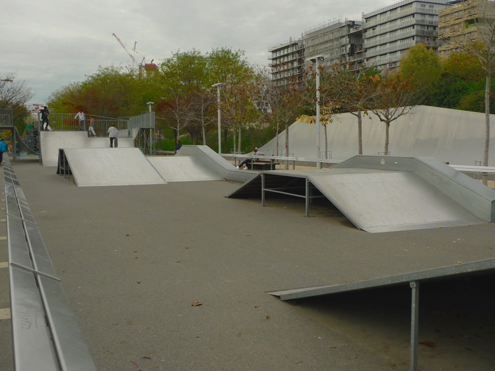 El parque está rodeado de edificios modernos y muchos en construcción. El nuevo edificio de la Cité de Justice, el edificio con 3 enormes bloques de vidrio azul domina el horizonte del parque. El parque es largo y tiene muchos espacios verdes. Tiene muchos árboles que dan mucha sombra. Son muchos los caminos que recorren el parque. El parque tiene muchas áreas de juego para niños, un área completa dedicada a patinetas y scooters llena de rampas, puentes de cuerda, un campo de fútbol, cancha de baloncesto, un estanque con lotos, espacio de exhibición, obras de arte, arenales y bancos para relajarse etc….