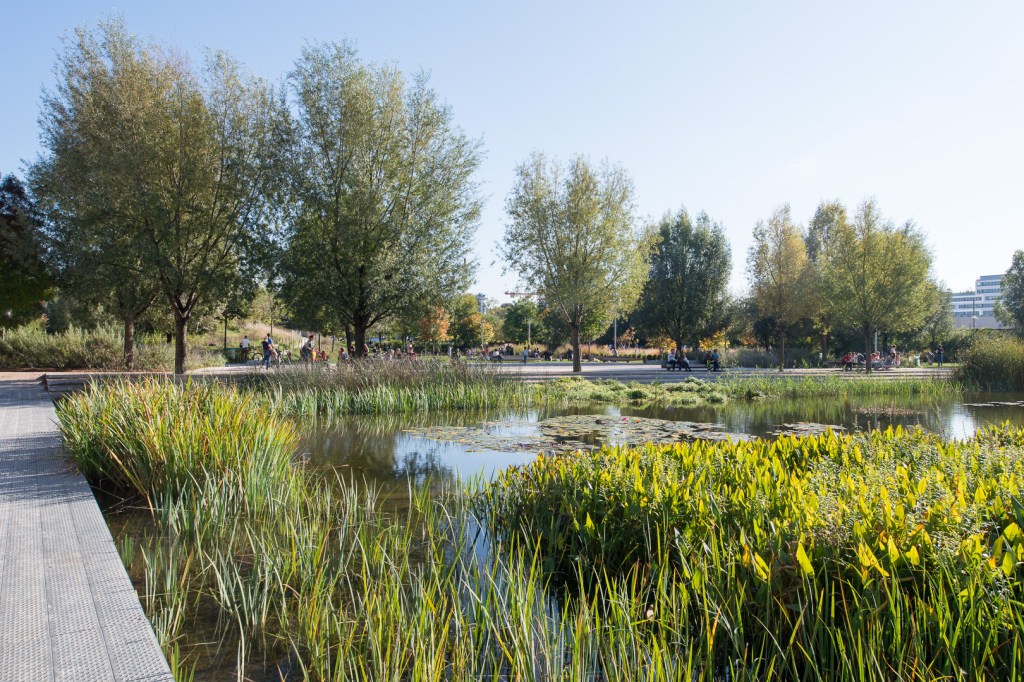 En cuanto al paisaje, se combinan diferentes artificios para amplificar los efectos de la naturaleza. El ciclo de las estaciones ha guiado la elección de las plantaciones para que de sur a norte, ninguna estación más que otra se destaque. Incluso cuando el agua fluye artificialmente, sus cualidades paisajísticas se combinan con sus propiedades ecológicas. Estos diferentes elementos del paisaje se presentan en varias formas: técnica, ambiental y divertida. En cuanto a los usos, con sus grandes espacios abiertos y sus lugares más íntimos, sus bandas activas dedicadas a los juegos infantiles y equipamientos deportivos que registran una nueva estética urbana, el parque se ofrece a multitud de prácticas.
