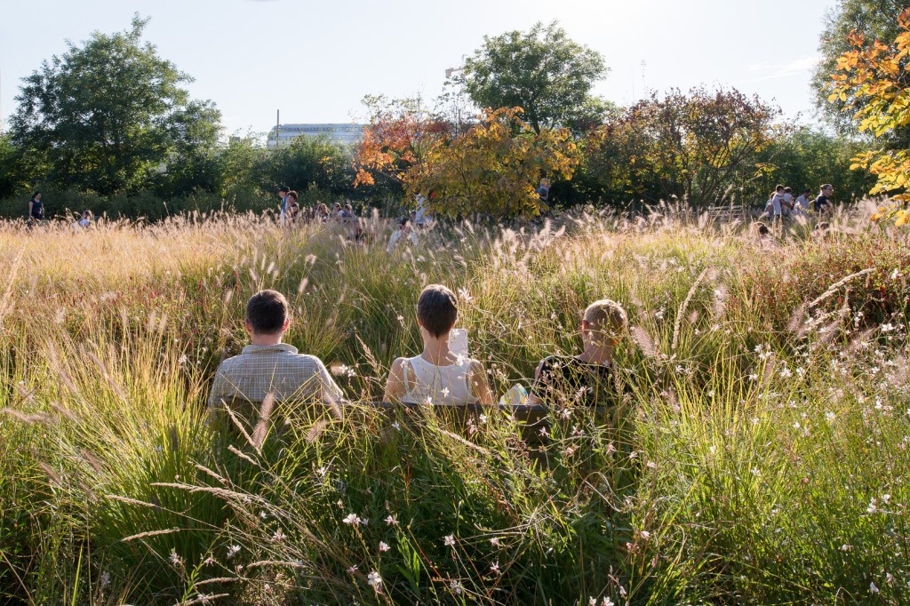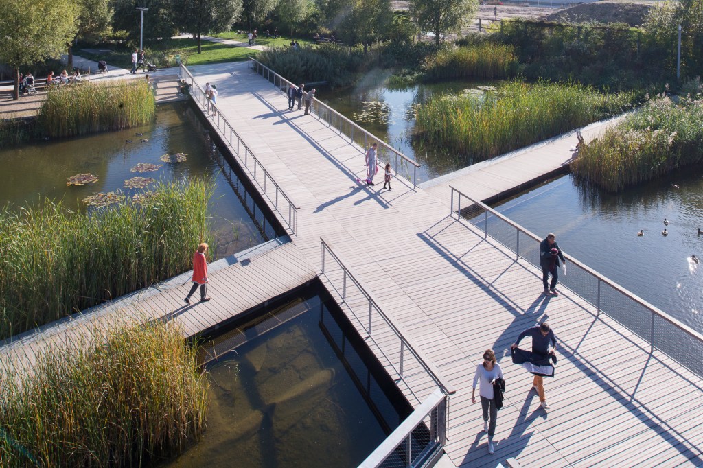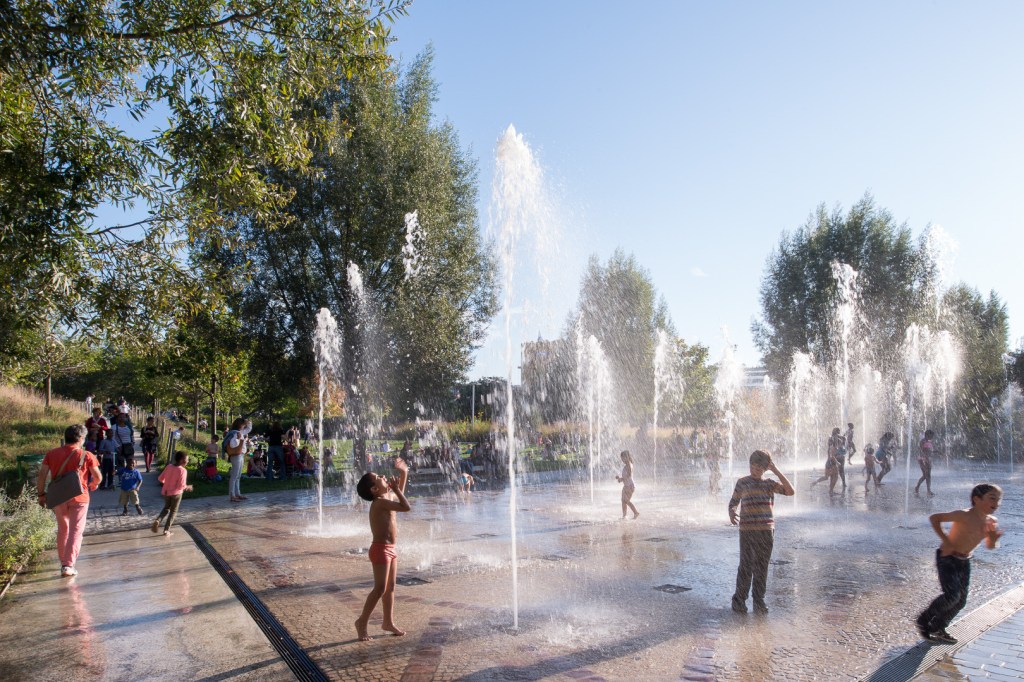 Los efectos de la luz del día y los atardeceres otoñales entrarán en juego con los robles carmesí que pronto se alinearán en varias pasarelas previstas para una fase posterior. Pronto, también, la sensación general de un bosque impresionará una vez que se plantan las maderas duras. El agua también es un actor importante y se manifiesta como fuente de vida, componente ecológico y apoyo al deporte y al bienestar físico, por no hablar de sus cualidades decorativas y reflectantes. A lo largo de una arteria, la cuenca del biotopo de más de 3.000 m2 recoge agua de lluvia para hacerla potable o para alimentar las plantas. Los chorros de agua también divierten y se suman a la calidad lúdica del espacio. El sonido de los niños jugando en una tarde soleada agrega una sensación por excelencia a cualquier parque de la ciudad,
