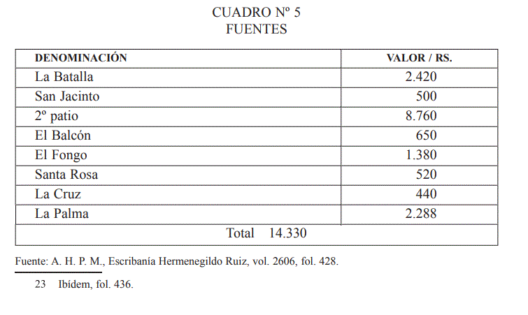 La finca del Retiro de Churriana (Málaga), modelo de hacienda agrícola en el siglo XVIII tes en esos momentos, la denominada de la Batalla era la más importante, seguida de la llamada de la Cruz y la de Santa Rosa. Los surtidores que embellecían y evocaban la influencia morisca se encontraban en el jardín viejo. El más grande de todos estaba formado por un pilar de ladrillos y la parte del saltadero con mármol blanco, valorado en mil reales, mientras que el segundo en la mitad.