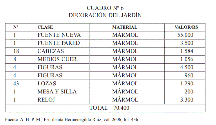 En el centro del jardín nuevo estaba previsto ubicar un conjunto escultórico mandado esculpir en Génova. En el momento en que se procedió a realizar el inventario se encontraba desarmada a la espera de su instalación, como se refleja en el manuscrito estudiado: