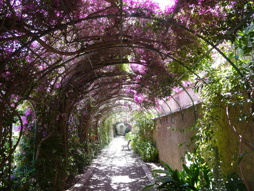 En el lado de poniente, aparecen tres terrazas longitudinales decrecientes en altura hacia el interior del jardín, mientras que en el lado sur una pérgola acompaña el acceso al mismo, permitiendo una visión global del jardín.