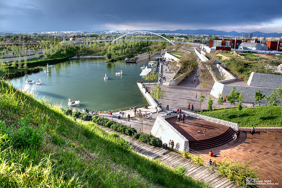 La topografía, con las diferentes cotas del terreno, consigue crear ambientes íntimos con amplias vistas. Recrea el origen aluvial del lecho del río, que favorece la formación de islotes de sedimentación por el paso del agua, característica de nuestra geografía. La disposición de estos islotes y la vegetación enriquece la secuencia visual de los recorridos peatonales y ciclistas.