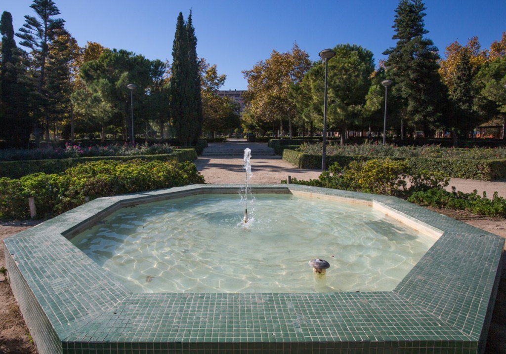 Destaca la gran fuente ornamental ubicada en el centro, formada por tres albercas circulares entre las que discurre el agua, alrededor de la que se articula el jardín. Éste alberga un variado arbolado, que incluye tanto árboles de hoja caduca como de hoja perenne, así como palmeras, encontrándose todo él rodeado por una valla con plantas trepadoras.