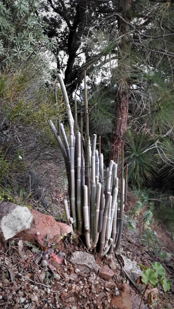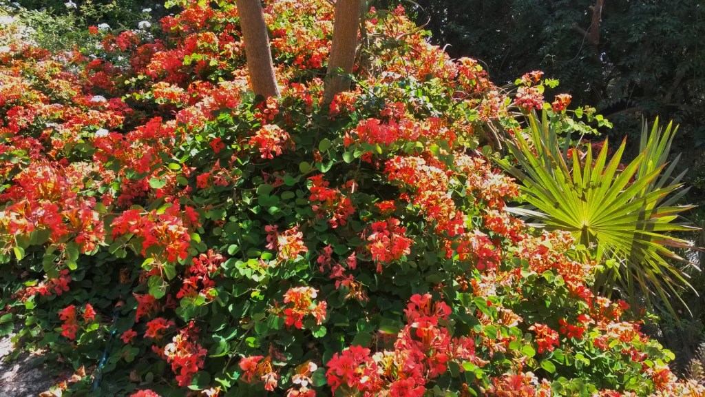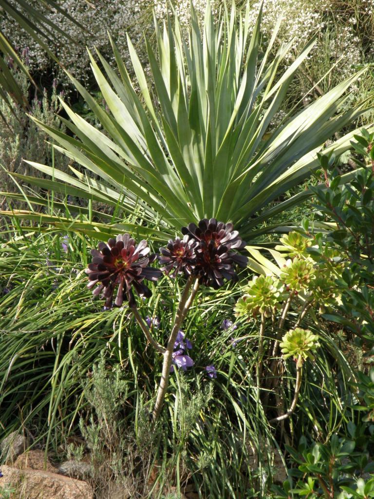 La otra parte, muy soleada, se ha plantado con plantas amantes del sol. Entre estas :palmeras con varias especies de Syagrus, Allagoptera, Trithrinax, Butia, Brahea, Jubaea, Bromelias xerófitas como Dyckia, Hechtia, Puya, y por supuesto, cactus y otras suculentas que necesitan poca agua en verano.