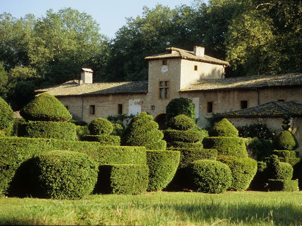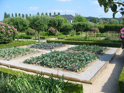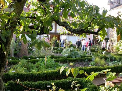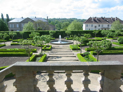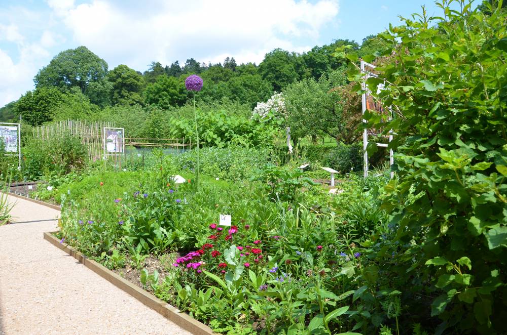 Reconstrucción de jardines franceses combinada con el estilo de un jardín de monasterio con plantas medicinales y aromáticas. Las plantas están etiquetadas con indicaciones de sus usos y propiedades medicinales, también vides, rosaleda, hortalizas viejas. Una escalera monumental domina el conjunto.
