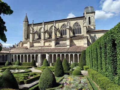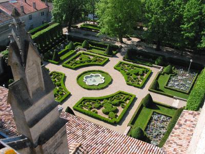 El jardín a la francesa: En 1953, el municipio acometió las obras de urbanización del recinto del claustro. Este se transforma en un jardín clásico de arte topiario, es obra de G.H Contant, Architecte y A. Larrègue, arquitecto paisajista, ingeniero hortícola, certificado por el estado de la Escuela Nacional de Horticultura de Versalles. Arici, contratista de Marmande, participa en las principales obras y movimientos de tierra. Inspirado en los diseños de los macizos de boj y tejo del jardín del castillo de Langeais, retoma las reglas de oro de los jardines franceses del siglo XVII con: – su planta geométrica, regular y simétrica, su armonía de proporciones, – su bordado de boj (Buxus sempervirens), su boj (Buxus microphylla) y sus tejos (Taxus baccata) cortados en conos, bolas o pirámides, – su cuenca central cuadrilobulada por donde fluye el agua que retoma los patrones de las ventanas góticas de la nave y que susurra para el visitante la tranquilidad del lugar, – su terraza que permite apreciar de un vistazo la composición del jardín, – sus muros de emparrado (Carpinus betulus) retomando el diseño de las galerías del claustro … Al final de 1959 finalizan las obras (plantación, desarrollo de la cuenca, movimiento de tierras, albañilería, obra estructural). Durante este trabajo se creó una verdadera unidad, magnificando el arte y la naturaleza.