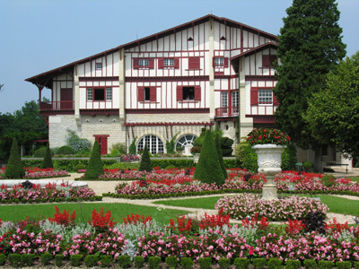 Nada más entrar en la propiedad, la casa del guardián indica el estilo neovasco elegido por el poeta. Más arriba, la antigua casa de los jardineros y los establos se apoderan de los entramados de madera y las aberturas arqueadas como introducción a la casa del maestro. Detrás de la pérgola, gallinas, patos, pavos reales y pavos restauran el corral que Edmond Rostand utilizó como mirador para componer la pieza de Chantecler creada en 1910. El jardín francés regular, basado en la simetría, está construido con materiales particulares: minerales, plantas y agua , bancos de piedra, cofias de estanques, escaleras, estatuas y grava de los callejones responden a tejos, carpes y bojes cortados en topiaria. Juegos de agua y fuentes completan la organización. El camino pavimentado que viene de la puerta grande conduce a la entrada principal de la casa. En medio de las glicinas, una pequeña puerta enmarcada por cipreses invita a descubrir el jardín inglés, dominio romántico y secreto del poeta. El cerro desciende hasta el arroyo Arraga cuyo cambio de una letra fue suficiente para nombrar la propiedad Arnaga. El molino ceremonial con su gran rueda de madera (ahora propiedad privada) fue solo una ilusión para completar la decoración de la casa de este escritor.