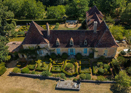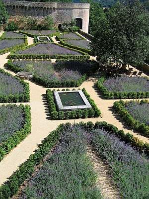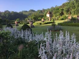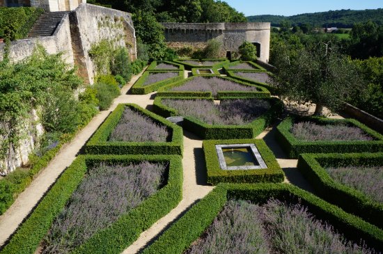 Este conjunto de bordados de boj, parterres y arbustos fragantes, tiras planas de rosas viejas, peonías y bulbos, está organizado con sencillez y elegancia. Un gran huerto ornamental, de inspiración florentina, con fuente, pabellones , completa este conjunto apreciado por los conocedores y único en el Périgord.