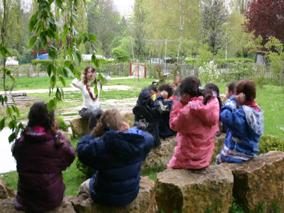 Jardín de los sentidos, puente entre generaciones: oído: con el laberinto de bambú (11 variedades); tóquelo: el camino de la corteza (vea la lista de árboles de corteza interesantes a continuación); el sabor: con el huerto (una veintena de variedades de manzanos incluidas las variedades locales), perales, albaricoqueros, melocotoneros, membrillos nísperos, higueras, así como una colección única en Francia de avellanos (30 variedades); la vista: con la pared florida (53 m de floración, con plantas perennes, arbustos, anuales) en los colores del arco iris; olfato: con el jardín de los aromas y su túnel (rosas, madreselva, clemátide, así como muchas variedades de mentas, tomillo, salvia, pelargonios fragantes); el jardín de flores: dalias, gladiolos, etc; que se utilizan para hacer ramos de flores para la residencia de ancianos; el jardín de los pájaros: ruta lúdica, camino donde las plantas introducidas tienen frutos para las aves locales; el jardín terapéutico: cerca de la residencia de ancianos: condimentos, plantas aromáticas y medicinales instaladas en camas a la altura de la silla de ruedas.