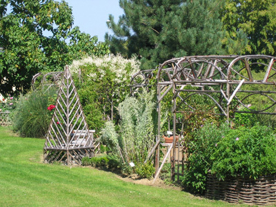 A ver: una huerta de 1900 en su recinto de piedra con árboles frutales en espaldera, presidido por un teatro verde, árboles centenarios (tulipanes, cedros, hayas purpúreas, tilos, rododendros), fuentes antiguas, un cenador verde en «cuna», prado florido (cortado a mediados de julio), hayedo.
