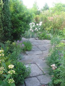 La parte inferior, un antiguo huerto trabajado durante generaciones, es la más rica. un camino de tierra separa estas dos partes bordeado en su parte soleada por una colección de lirios y amapolas orientales, en su parte semi-sombreada por peonías en árboles y arbustos.