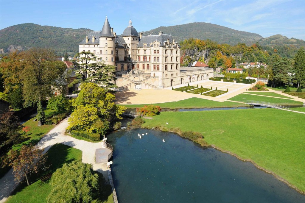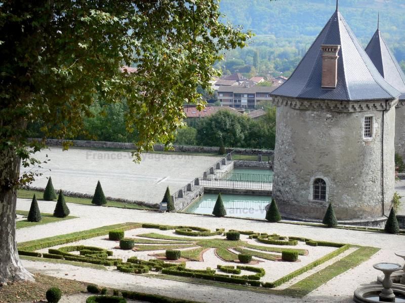 Emblemático castillo del Dauphiné, debe su fama a sus excepcionales jardines, dispuestos en el corazón del siglo XVIII. El acceso se realiza por dos majestuosos callejones de árboles centenarios que conducen al patio principal donde, con vistas al castillo, destaca una espectacular escalera de agua de estilo italiano. Esta escalera de agua es una obra maestra de la arquitectura de jardines, única en Francia. Es alimentada por las aguas vivas de un torrente de montaña y una profusión de manantiales apartados y luego conducidos en una sucesión de estanques y fuentes. El agua se distribuye de arriba hacia abajo mediante un simple flujo por gravedad, a través de una gran red hidráulica de tuberías de piedra.