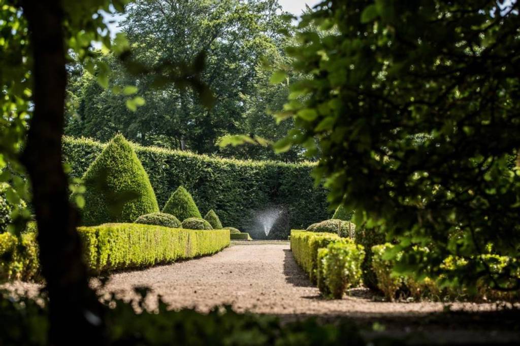 Un callejón bordeado de pérgolas de casi 5 metros de altura conduce al patio principal en forma de media luna del castillo. Consiste en prados salpicados de boj y tejos podados, así como estanques.