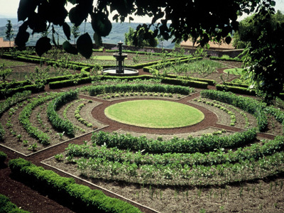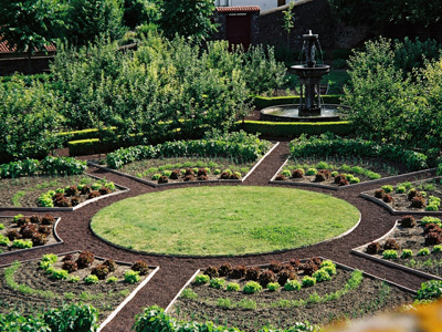 Huerta francesa, huerta. Elementos notables Estatua, Edificio, Fuente. Elementos vegetales Arbustos, plantas perennes.