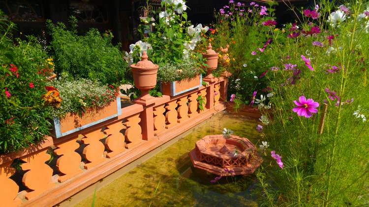 Pero la gran riqueza de estos jardines son sin duda los numerosos juegos de agua que brota y corre perpetuamente en cuencas, chorros de agua y piletas.