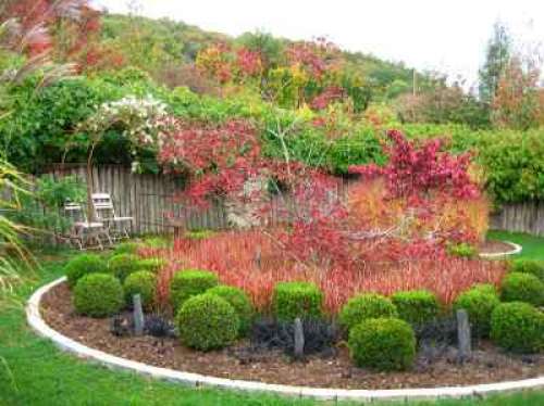 Seis setos, chamaecyparis stricta, laurus cerasus, thuja, tejos, protegen del viento del norte al sur y crean microclimas propicios para bulbos frágiles y algunas sarmentosas y clemátides persistentes. Estos últimos trepan en los cedros a más de 8/10 metros.