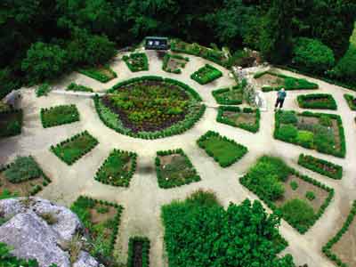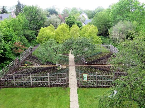 Finaliza con un laberinto de seiscientos manzanos y perales realizados según los preceptos de la poda de frutos viejos (cuarenta formas de frutos diferentes). El jardín de rosas plantado con rosas viejas conecta las dos partes principales del jardín. Una terraza florida lo domina. Un espacio frente al castillo se dedica en primavera a la floración de cerca de 500.000 narcisos, y en otoño, al espectáculo de árboles seleccionados por el color de sus hojas en ese momento.