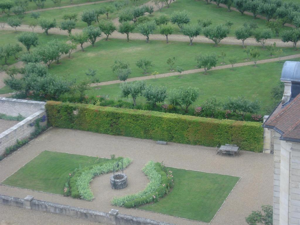 - – un camino de agua discurre a lo largo de los parterres de la fachada sur, es abastecido por una cisterna medieval encontrada durante los trabajos de paisajismo del parque