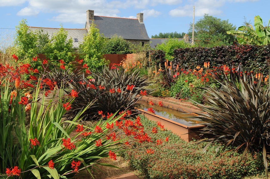 En el solar de un huerto y un huerto contiguo a una antigua masía rehabilitada como vivienda y taller de escultura, comienza la historia de este jardín. Fue en 1992 que el deseo de crear un jardín de placer se convirtió en un proyecto familiar, porque la pasión por la jardinería vivía tanto en padres como en niños. Y fue entonces cuando empezamos a cavar estanques, a trazar caminos bajo los viejos manzanos y a florecer los diversos macizos que nacían de nuestra imaginación. Luego, para estructurar el conjunto, plantamos arbustos, modelamos muros bajos y pavimentos, inspirándonos en diferentes estilos de jardín.