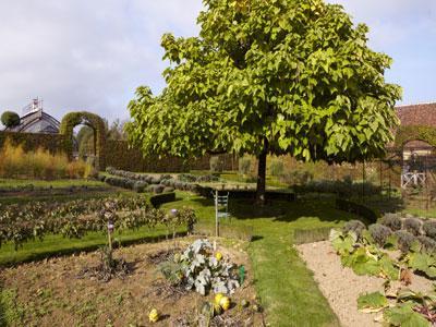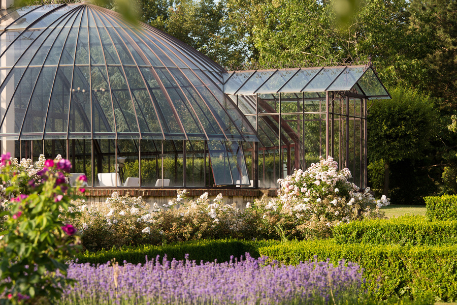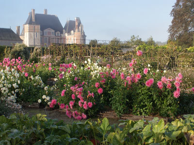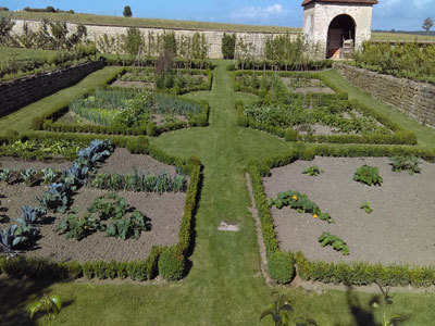 En cuanto al invernadero que da a la cámara de calor, ahora está ocupado por una exposición. Es importante notar un vínculo directo entre el pintoresco parque y las huertas: hay que caminar por el parque para llegar a las huertas. Los huertos representan un recinto de 5244m² rodeado por un recinto poligonal de 3,60 m de altura con la particularidad de que ningún muro queda expuesto al norte. Todos los muros periféricos están cubiertos con árboles en espaldera. En este recinto se han creado nueve jardines, cada uno de ellos rodeado por un seto de boj recortado. Cerca de los pabellones de entrada se encuentran los huertos infantiles.