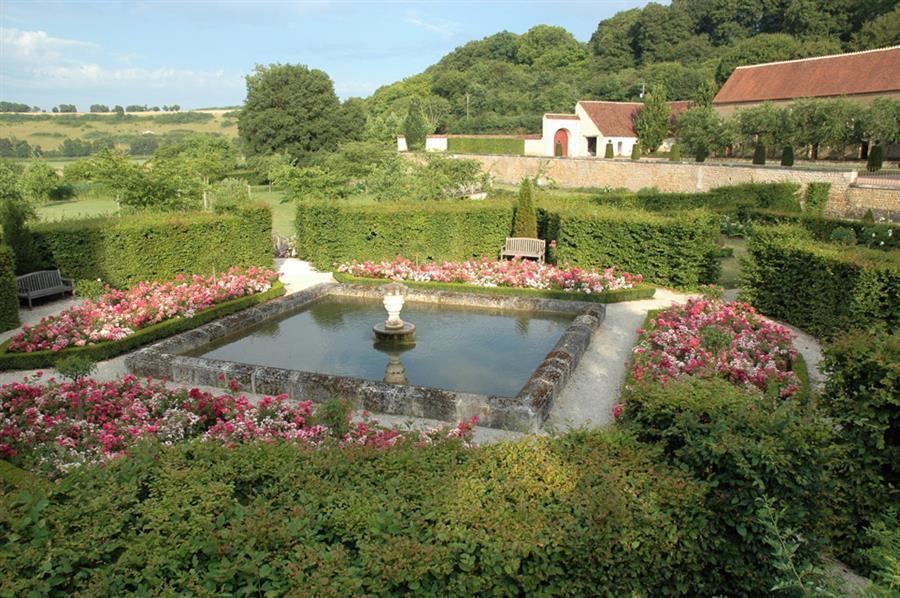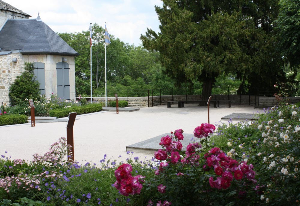 Uno de estos macizos alberga la rosa Alix de Vergy, que lleva el nombre de la segunda esposa del duque de Borgoña Eudes III. Un camino de agua fluye en dirección al paisaje, invitando al paseo.