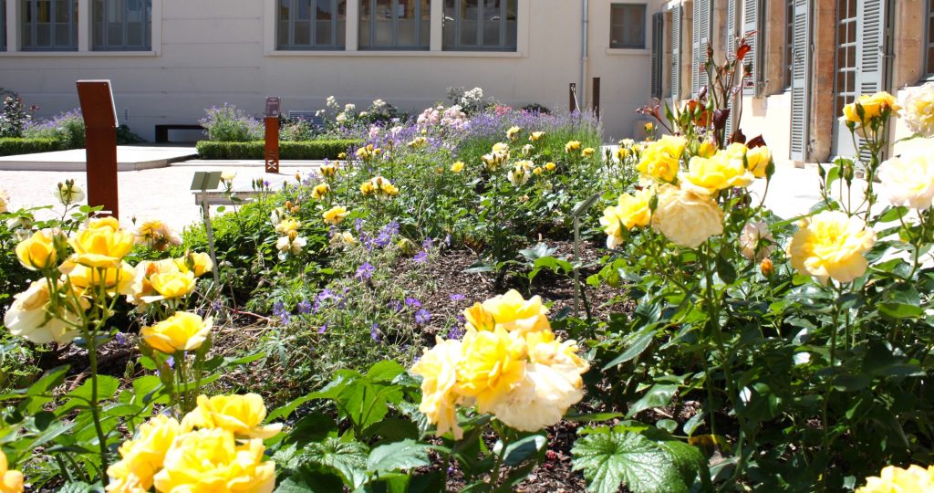 Plantas notables: colecciones de rosas, elegidas según su floración en el momento de su creación (muy antiguas, siglo XVII, siglo XVIII, siglo XX y siglo XXI), la ciudad encargó la creación de una rosa, también conocida como Alix de Vergy. como Rose de Talant para instalarlo en este jardín. Se han conservado tres árboles del antiguo páramo: un tejo, un tilo, un boj. Gestión del jardín Se instaló riego automático por goteo desde el diseño del jardín, se conecta a una cisterna medieval para la recogida de agua de lluvia que también abastece al canal. Las plantaciones seleccionadas de rosas y plantas perennes consumen poca agua y se ha instalado mantillo para limitar la evaporación. El mantenimiento lo realiza una persona un día a la semana y se realizan entrevistas especiales todos los días antes del evento.