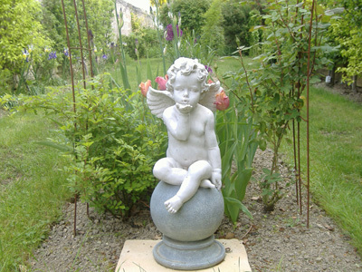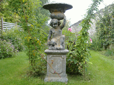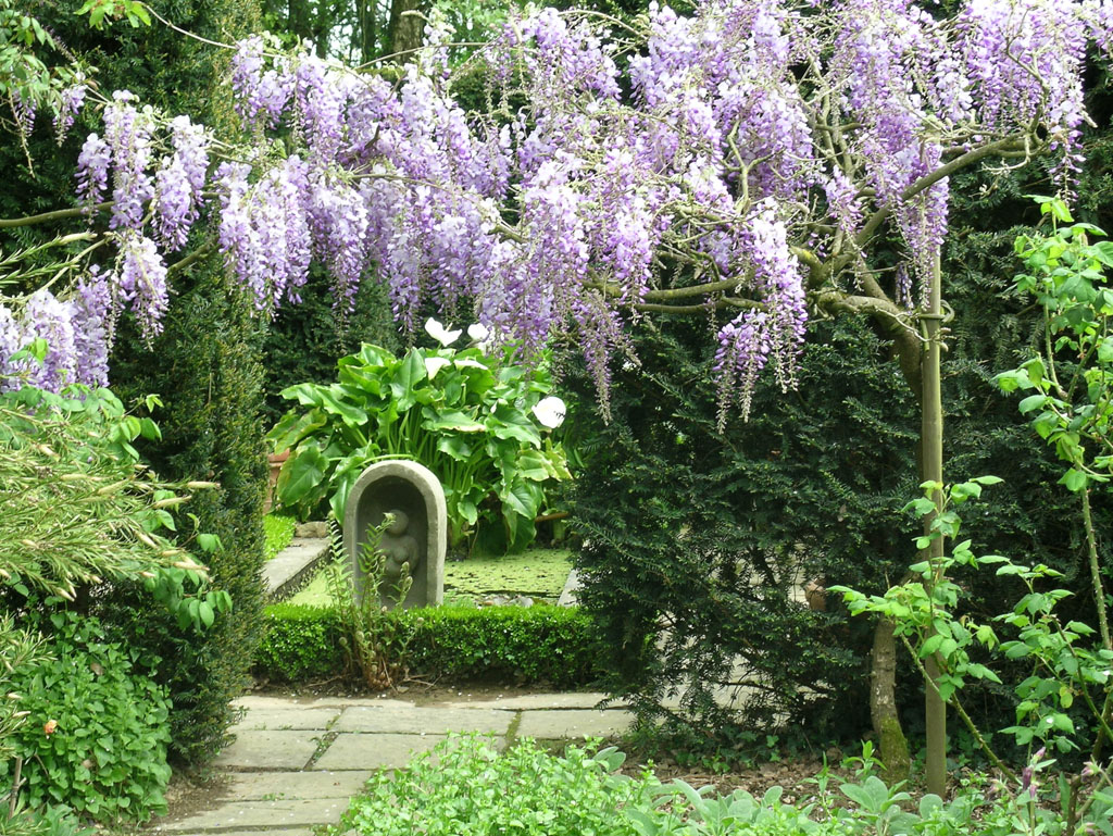 Volviendo a la casa, llegamos al claustro de la glorieta a través de una pequeña terraza detrás de un muro de piedra seca. Entras por una puerta abierta en el seto. A su alrededor se disponen sus cuatro matas de flores blancas rodeadas de boj y en su fuente, bajo las arcadas, se levantan esculturas que simbolizan las estaciones. Frente a la casa, el jardín está cerrado al sur por piedras originales levantadas, al norte y al este por un muro de piedra. Consiste en una terraza de losas de labranza bajo un tilo cortado en forma de sombrilla. Bordes, bordados y bolas de boj, plantas perennes, arbustos y plantas en macetas, adornan el conjunto.