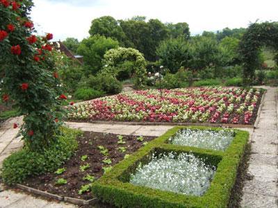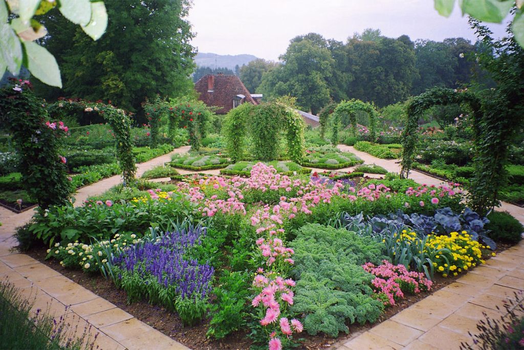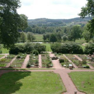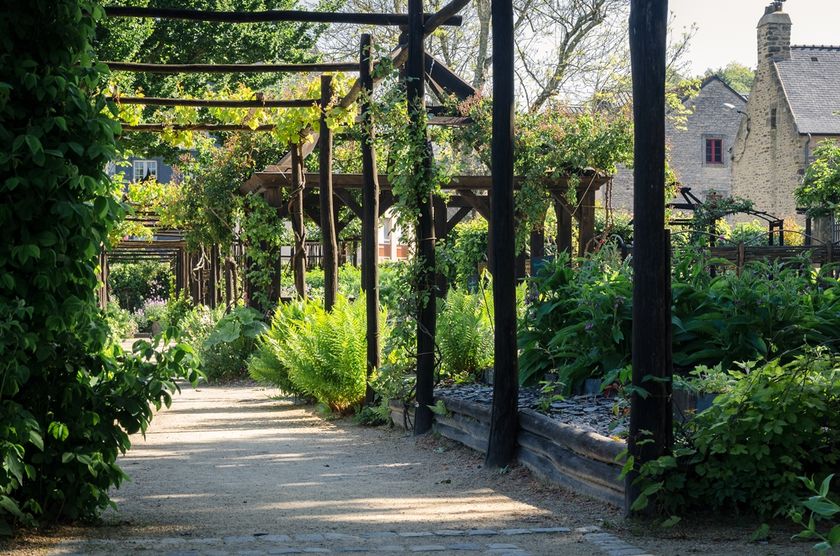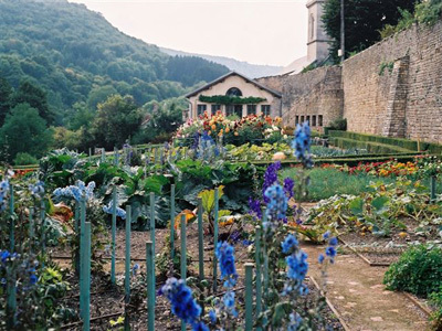 Castaños, robles, pizarra, granito y acero golpeado con hierro son los materiales básicos. El jardín está cerrado, rodeado de plantas trepadoras y rosas. Los diferentes macizos elevados están dedicados a plantas culinarias y medicinales como el mongette, la borraja y árboles frutales como el níspero. En su centro, un quiosco alberga una fuente, símbolo de la fuente de vida que alguna vez regó el paraíso. El jardín mariano está hecho de plantas traídas de las Cruzadas. Plantas aromáticas y sauces completan las plantaciones.
