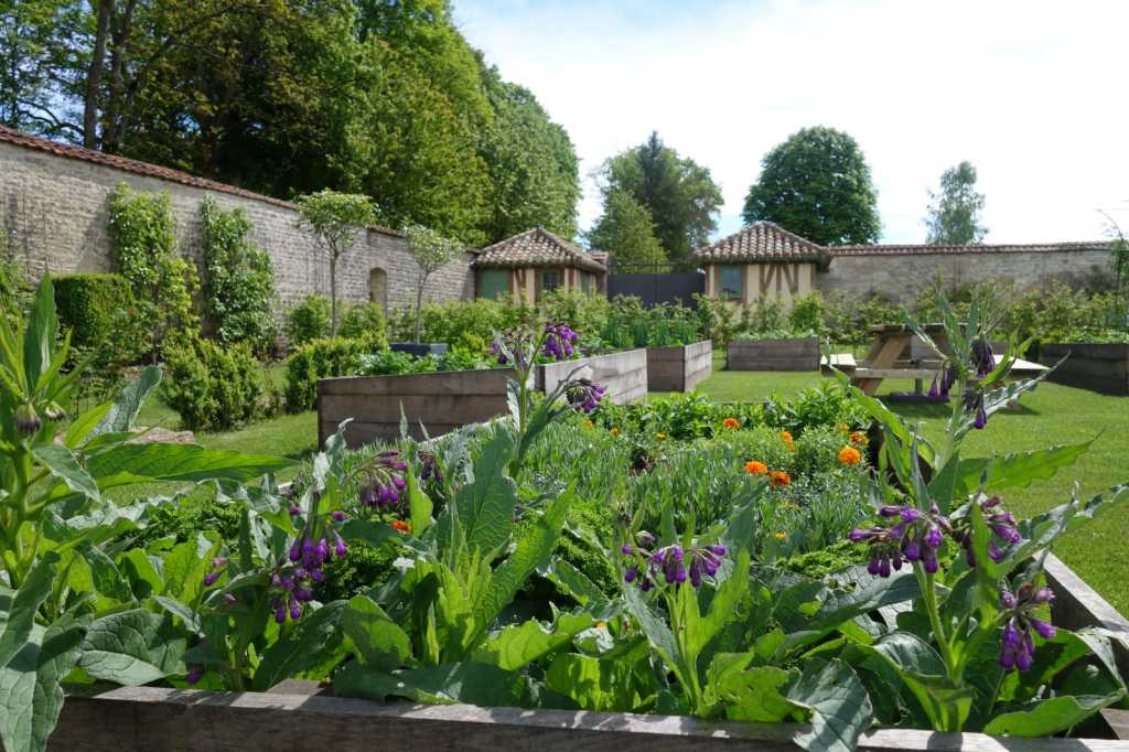 Más allá está el jardín melífero con su colmenar. Luego, el jardín de cordones que alberga una selección de manzanos. Al otro lado del callejón en cunas está el huerto con su podredumbre y más adelante, el huerto de cassissiers (especialidad del pueblo de Montigny-sur-Aube). Más allá de la laguna del jardinero, está el jardín de frutos rojos a la izquierda y el jardín de abono verde a la derecha. Eventualmente, un mirador ocupará la parte posterior del jardín, en el eje de las cunas y un jardín de rosas se acurrucará en el ángulo de las cunas.