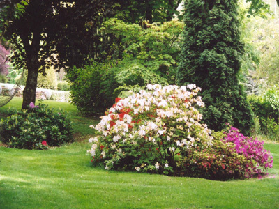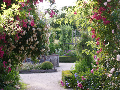Jardín francés en terrazas Parque inglés, huerto, huerto. Gran cenador del siglo XVIII plantado bajo un roble Luis XIII de 500 años. Muchos árboles raros y seculares (haya púrpura, ginko biloba, nogal americano , magnolia grandiflora), muchos rosales viejos, numerosos e imponentes grupos de rododendros en el borde del valle de Rance en medio del bosque.
