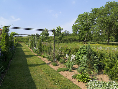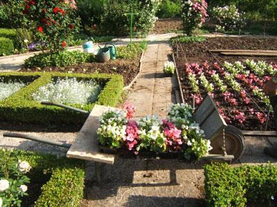 Setos de boj, amuletos y tejos delimitan las distintas estancias del jardín: el jardín de flores alrededor de la cabaña, el jardín aromático alrededor del invernadero, el jardín acuático alrededor del aerogenerador y las huertas donde se mezclan verduras, flores y trigo.