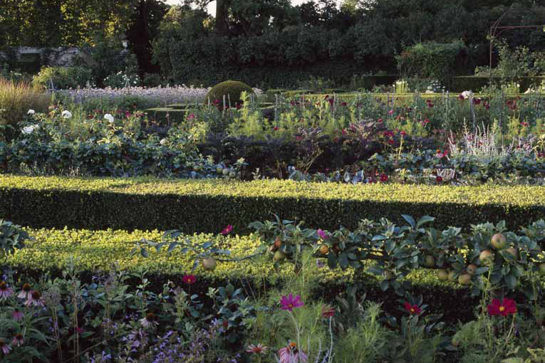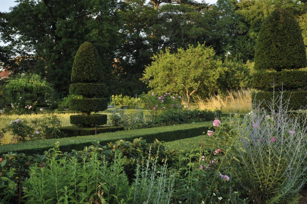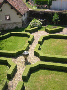 Un jardín geométrico estructurado por bancos de boj subrayados por topiarias de bolas, hace el vínculo entre la torre de defensa y el castillo. Se puede acceder a la antigua huerta a continuación a través de un túnel debajo de la carretera. Los espejos de agua, como fragmentos rotos, juegan con el azul del cielo y el canal privado. El tamaño ondulado del boj responde con humor a la arboleda circundante y obviamente recuerda los setos de Bazois.