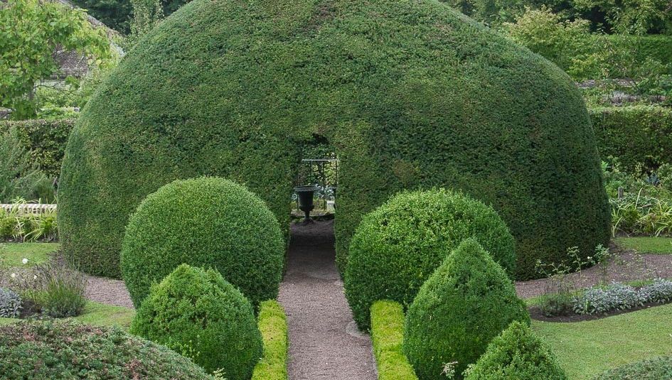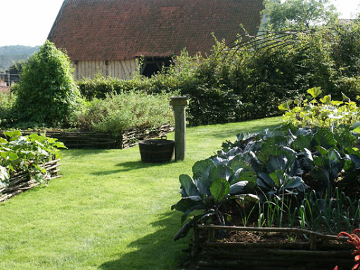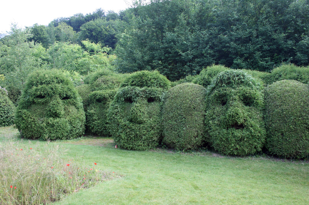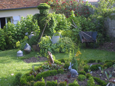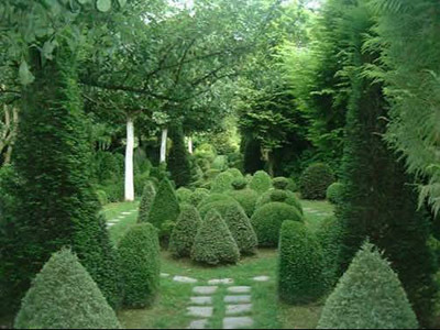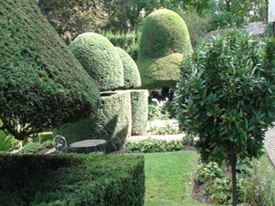 El pueblo medieval (y antiguo bastión) de Gerberoy (Oise, Picardie) es un sitio protegido (1h30 de París). Nuestro jardín de estilo francés, simétrico, en terrazas y que incluye todo el campo circundante, es muy particular por la presencia de tejos centenarios, podados y monumentales. Gabinete de vegetación (bajo el cual uno puede pararse), o sombreros de tejo, sus formas son impresionantes. El jardín es verde y gráfico durante todo el año gracias a los tejos. La casa (1744) perteneció al gobernador (Vidame) de Gerberoy. Jardín de rosas. Huerta de permacultura. El jardín de tejos está rodeado por la muralla de un lado y un viejo muro de barro por el otro.