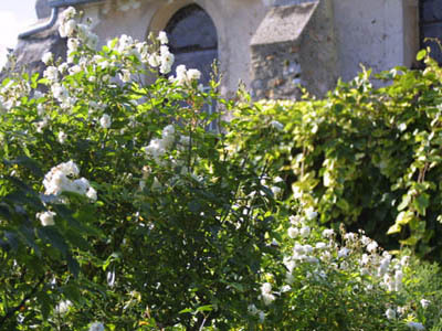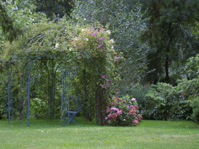 En el centro, rosas muy floríferas y en ascenso aportan un toque de color y vaguedad en este encaje verde muy estructurado. El jardín de boj está cerrado por sus cuatro lados: dos de piedra (la casa) y dos de vegetación (el cenador). Una arcada tallada en los encantos se abre a la terraza inferior. Vemos la pequeña torre cuadrada a la derecha; desde el jardín no se puede imaginar su impresionante altura, que se ve cuando se está en la carretera que va de Largny sur Automne a Vez.