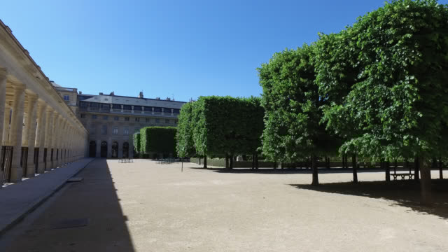 El caminante accede al jardín a través de galerías llenas de tiendas. El patio principal alberga las columnas de Daniel Buren y las fuentes de Pol Bury. La galería de Orleans separa el patio principal del jardín, donde cuatro filas dobles de tilos cortados en forma de marquesa se alinean en los caminos del jardín. Entre estas alineaciones, dos grandes prados delimitados por parterres enmarcan la gran cuenca central y sus fuentes de agua. En los extremos de los parterres, se habilita un espacio para los caminantes. Rodeados y protegidos por parterres de flores, pueden descansar allí y admirar el jardín y la arquitectura del palacio.