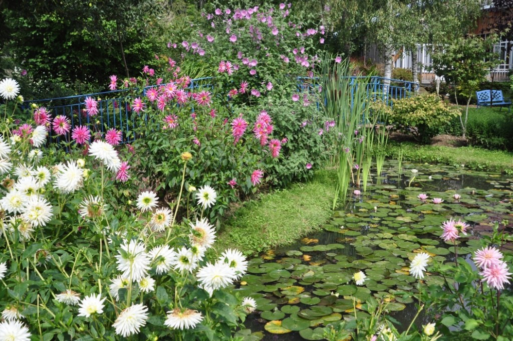 Árboles, arbustos y flores rodean siete piscinas unidas por cascadas, atravesadas por un puente descentrado, un puente Picard y pasarelas. Los elementos vegetales principales y emblemáticos de este jardín están representados por colecciones de nenúfares, hortensias, dalias y árboles notables.
