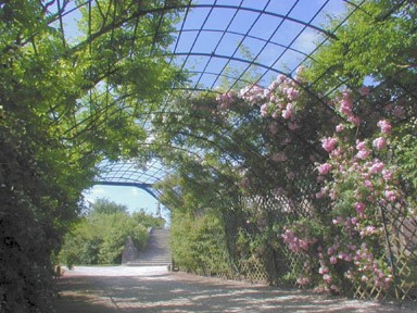 Armario enrejado y pérgola de claustro, treille 120m Muro de cerámica pintada a mano (15m) Teatro en enrejado cubierto de lona (estilo del siglo XVIII) Cascadas 40m 9 cascadas y 1500 rosales